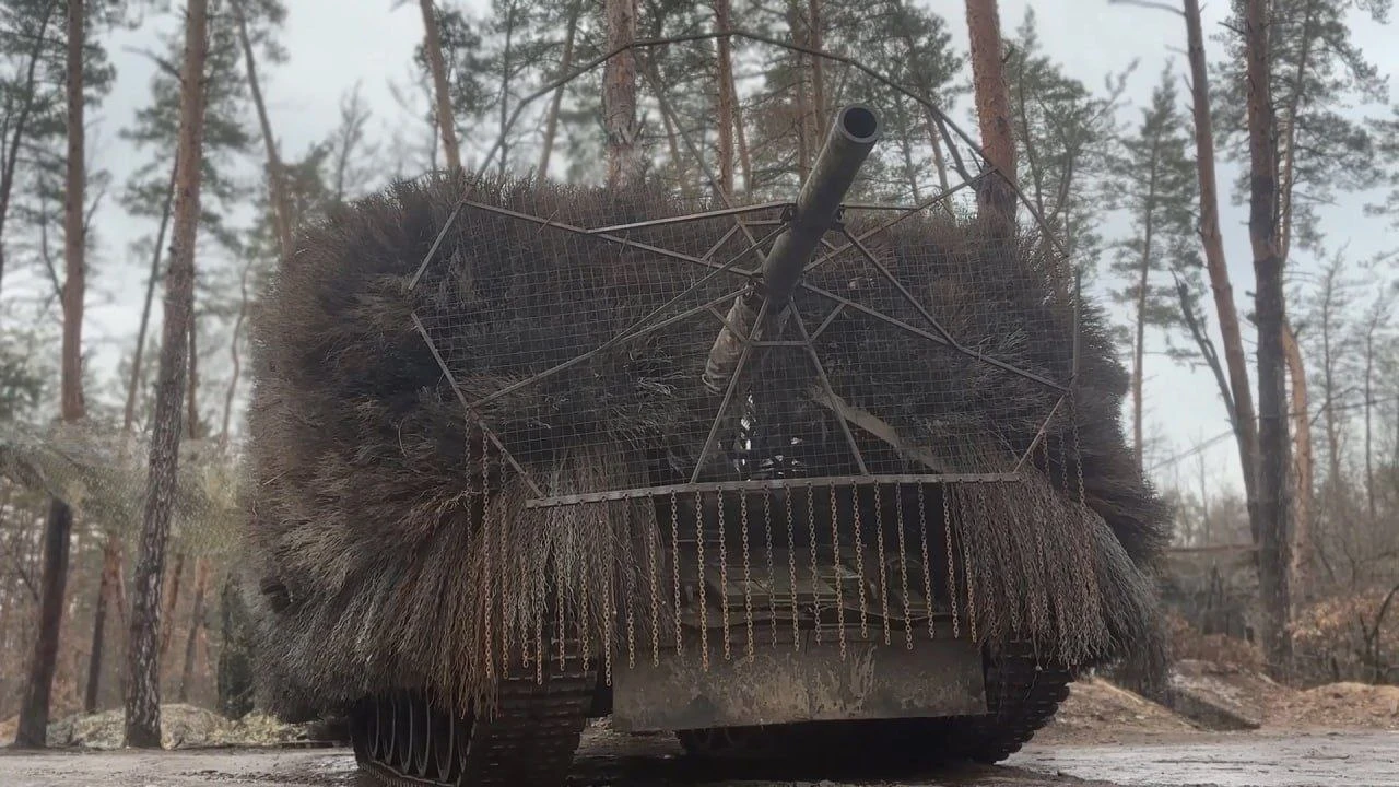 Это не новый российский танк, а Т-80БВ с дополнительной противодроновой защитой. Телеграм-канал, поддерживающий вторжение в Украину, скептически замечает, что 1300 элементов из расплетённых тросов в совокупности дают свыше 20 тонн дополнительного веса, что пагубно влияет на ходовую боевой машины.